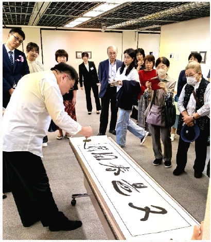 展览开幕式上,上海中国画院画师庞飞和日本读卖书道会理事、谦慎书道会常任理事疋田惜阴分别代表中日双方艺术家致辞。两位艺术家还在现场挥豪泼墨,笔走游龙,“墨缘奇妙”“又是春风”的墨迹跃然纸上。