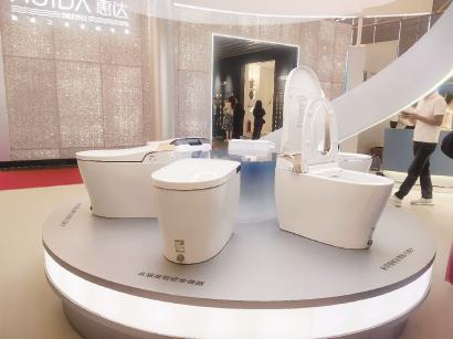 “坐上马桶,腿稍稍轻抬,3秒钟左右的时间,测出来我的体重是87.8KG,BM I指数是24.9,偏高……”在摩恩展台,一位工作人员正在演示通过智能坐便器进行身体健康监测的过程。