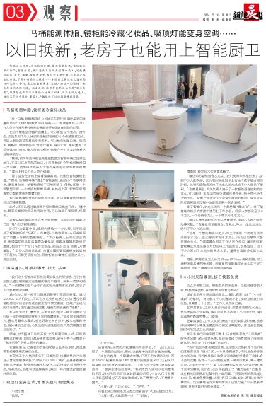 智能卫生间里,马桶能测体脂、监测健康数据,镜柜能冷藏化妆品;智能浴室,淋浴篷头不再只是极简和嵌入,还能模拟瀑布、极光、按摩;智能厨房里,吸顶灯变身空调、水龙头也能智能集成,下厨幸福感大大提升……中国厨卫展正在上海新国际博览中心举行,展上的智能厨房、卫浴产品让人们看到了未来厨卫的无限可能。记者发现,这些智能厨卫也不是“新房专属”,很多智能产品可以很轻松地用在旧厨、旧卫生间改造上,询问不下十个展台,商家几乎都推出了以旧换新升级服务。