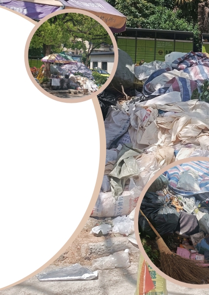 5月16日中午,记者在场中路2600弄幸福一村院墙外找到了这堆垃圾。垃圾堆所在的位置是一个“丁”字路口,往东是幸福新苑,往西是洪泉居委,往北左边是幸福一村,右边是场中路2380弄小区。这个地方早晚人来人往,车辆密集。整个小区的快递柜都集中在垃圾堆后面,取快递的人无一例外都要向垃圾堆行“注目礼”,并绕着垃圾堆行走。