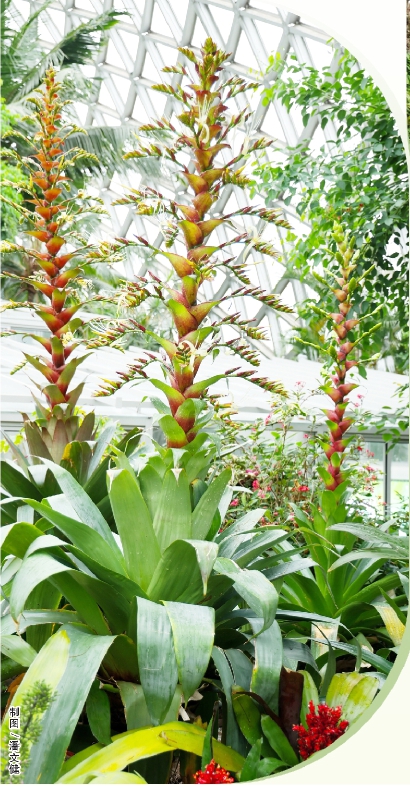 以帝王凤梨为代表的卷瓣凤梨属植物原产巴西东南部,开花高度大多在2米以上。从2015年开始,辰山植物园每年都有卷瓣凤梨属植物开花,2019年有2株红叶型帝王凤梨开花,2023年有5株红叶型帝王凤梨开花,今年又有3个类型的7株帝王凤梨同时开花,这3个类型分别为红叶型、绿叶型和奇异鸟型,是帝王凤梨开花数量和类型最多的一次。