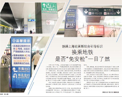 昨天,记者在上海站站台看到,多根立柱上已经张贴了新的标识,上面注明:东北、东南出口,乘坐地铁1、3、4号线免安检。
