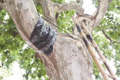对于日常绿化养护巡查中发现树木出现白蚁,暂没有大量分飞的情况下,剥开白蚁蚁路喷药粉,然后覆盖草纸、包裹黑色塑料袋,让蚁路不要透光,以防白蚁知道有人发现了它们的踪迹、并“破坏”了蚁路而打草惊蛇,等工蚁沾染了药粉,回到巢穴把身上的药粉传给其他白蚁,逐渐杀灭整个白蚁种群。“因为现在规定使用低毒药粉,剂量也有所控制,所以这种方法见效较为缓慢,有一个杀灭的过程。”