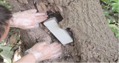 在不太确定是否有白蚁的情况下,还采取设置“监测站”的办法,这种办法通常在公共绿地里使用,将一个直径七八厘米,高度约20厘米的圆锥状装置埋入土里,露出上方口,圆锥体四周放置小木片,如果有白蚁,小木片会受到啃食,这样确定有白蚁之后,在里面投放饵剂。