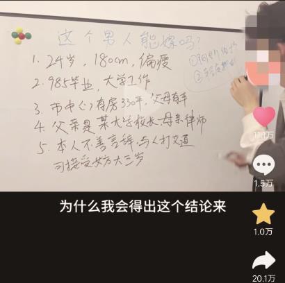 翻遍各路相亲分析师的视频,晨报记者发现,白板上的题目竟然惊人的雷同,十条有九条都是“这个男人能嫁吗?”出镜的相亲分析师几乎也都是男性。