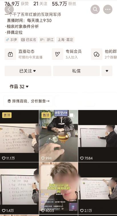 他在抖音上发布的32条短视频,有20条标题为“这个男人能嫁吗?”还有1条门店约会信息,5条回应粉丝的字幕,6条相亲咨询解答,标题分别为“女孩子的价值只有生育和年龄吗?”“软饭来源”“独生女吃绝户的骗局还有多少人不知道”“怎么聊彩礼,才能既让对方不敢少给你,又不显得在卖闺女”“相亲后常见的6种情况该如何应对”以及“妈宝男的4大特征”,都是能上热搜的话题。