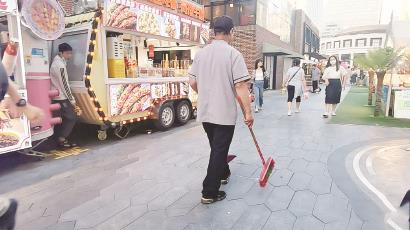 商贩口中的大叔,是指活跃在吴江路上,身着灰色制服的保洁人员。作为街面卫生维护者,他们手脚不停,一直拿着扫把、簸箕,巡视着整条步行街。这些大叔,是找不到废物箱的市民们的主要求助对象,他们是维系吴江路街面整洁的幕后英雄。
