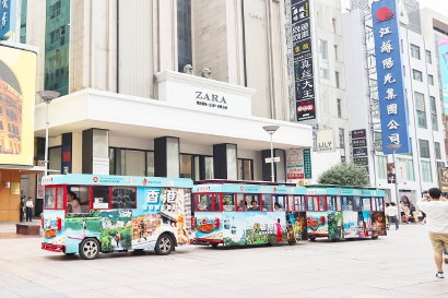 除了展览,在上海最繁华的街区——南京东路步行街上,大家还能看到多辆观光车披上新衣,展示香港最新旅游特色,这些观光车将在步行街上穿梭至7月31日。