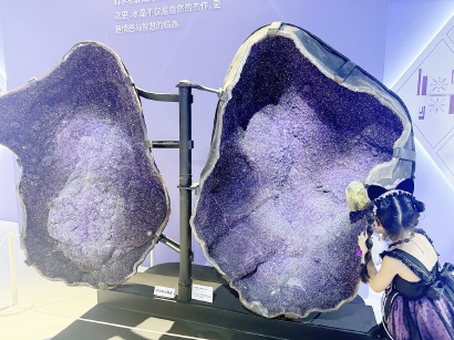 一只如展翼紫蝶的紫水晶晶洞在光影舞动间牢牢地吸引了观众的目光。这只晶洞,晶体结构清晰,发色浓郁,两侧晶洞对称,宛如振翅的蝴蝶一样灵动。最妙的是,展呈还将其和投影结合,在舞动的光影中,一只蝴蝶翩跹而出,水晶世界也有了缤纷的生命。