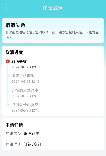 直到6月23日入住迪士尼酒店当天,张女士才匆匆向“去哪儿”平台提交了退订申请,可是没过多久,平台回复张女士:“非常抱歉酒店拒绝了您的取消申请,建议您按时入住,以免发生损失。”