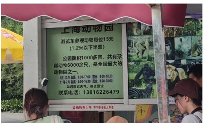 “(乘)游览车参观动物每位15元(1.2米以下半票),营业时间:8:30-16:30(如遇恶劣天气,停止营业)。”7月24日下午,记者来到上海动物园游览车售票点,售票点公示的信息显示,售票点的营业时间到16点30分,售票处工作人员桌子上还放着一块牌子,特别提醒:“(下午)五点前随意上下”。