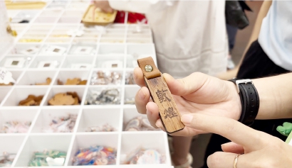 红绳加神兽金属小豆子,可以组成一个红绳手串;也可以用棕色挂绳加皮质手印加敦煌汉简,就是一个棕色系挂件。记者看到DIY区域一直围满了游客,还有工作人员指导怎么编手绳、怎么搭配。