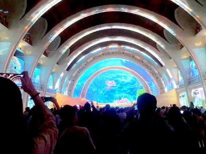 中央大厅内,也有不少观众。原本,中央大厅每天安排4场穹顶投影秀,下午2场,晚上2场,而从当天的实际情况来看,播放场次远远超过4场。与此同时,东、西两个花园以及东广场的投影秀、光影装置也吸引了不少市民。整个展览中心的客流虽不及上海书展火爆,但也是相当多了。