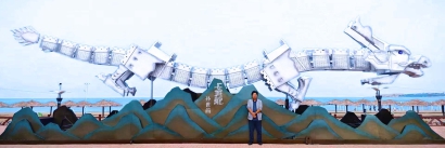 坐卧在海岸边的这条长龙,身长近20米,高达6米,总重量约为10吨。在静态时,它呈现为一座白色的长城造型,仿佛横亘于巍巍群山之间;而当机械装置启动后,长城则缓缓震动并逐渐抬升,部分结构变形为龙头和龙尾,最终幻化成一条栩栩如生的巨龙。