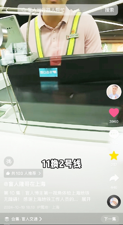 不过隆哥也遇到一个问题,部分地铁站的通道太长,以离他工作地点最近的徐家汇站2号口为例,记者从入口走到服务台需要接近10分钟的时间,隆哥表示作为视障人士需要更长的时间。