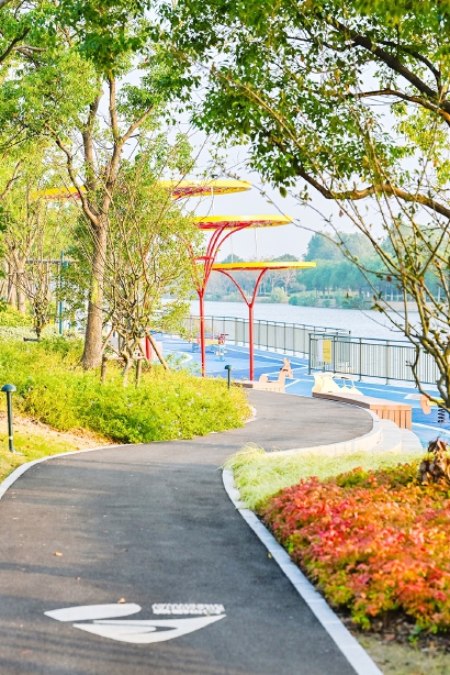 如今的梦享公园,绿环双线环绕、设施完备:滨水绿带新增的骑行漫步双道封闭连贯,串联起12个景观打卡点;沿途依次树立了从1公里到10公里的标识牌,增设了更衣室、卫生间、休息驿站等各类服务设施。市民、游客可以穿梭于滨水森林之间,散步、跑步、骑行或开展其他赛事,尽享亲近自然之趣。而公园一侧的川迪河则是水上运动爱好者的天堂,龙舟、赛艇等活动贯穿全年,跑道与河道交相辉映,10公里滨水带串起健康生活。