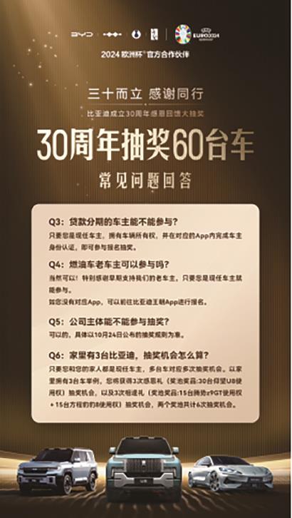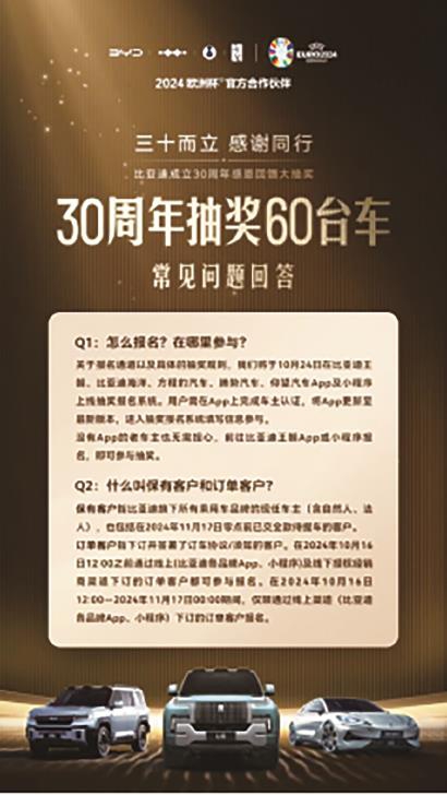 据了解,比亚迪30周年抽奖活动将于10月24日正式开始报名,活动将持续到11月17日结束。具体报名方式将在比亚迪王朝、比亚迪海洋、方程豹汽车、腾势汽车、仰望汽车App及小程序上开放。没有App的老车主也无需担心,前往比亚迪王朝App或小程序报名,即可参与抽奖。