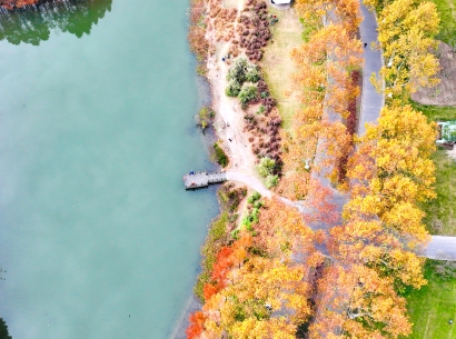 这个时节,“莫奈花园”已不仅仅是共青森林公园小桥旁那一个景点,整个公园仿佛都成了莫奈的油画。水杉、乌桕、红枫……各种色叶树都已经开始变色,暖阳下,或金黄或褐红,与翠绿的枝叶相互交叠,形成了一幅颇具韵味的画卷。