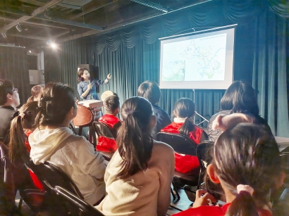 讲座的主讲老师关燕茹,是敦煌研究院莫高学堂研学经理、资深双语讲解员。她向我们展示了一幅幅敦煌莫高窟中的壁画。壁画中,唐代的飞天丝带都打着卷,飘逸灵动;而隋代的飞天丝带,却像是被风吹得笔笔直。原来,不同朝代的飞天造型竟然是不同的,这也从一个方面表现出当时环境下人们的审美观和文化特色。