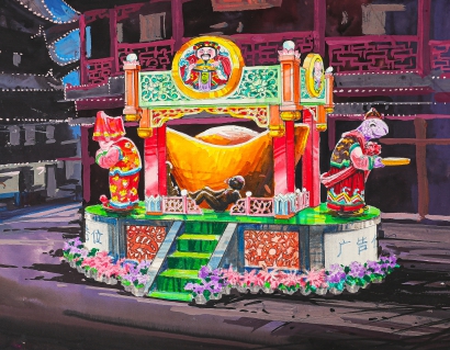 “白天在豫园商城里采风,晚上在十六铺小旅馆里画稿,当时的负责人觉得不错,便开始了与豫园的合作。”李微微和万松涛回忆起1999年是第一次与豫园灯会的合作,当时他们刚在杭州做完国庆50年灯展,打算来上海放松一下。来到豫园商城,李微微觉得这是一个办灯会的好地方,与负责人联系后,双方交谈甚欢、一拍即合。李微微和万松涛当即开始构思、创作、画稿。白天用相机把豫园商城的角角落落拍成照片,晚上用彩铅把脑海中的构思描绘于纸上。结合2000年龙年,十几天里他们共创作了十六个方案,这些画稿让人眼前一亮。灯还没安装完,他们的作品就被一位保安赞赏:“今年的灯比往年的好看。”李微微还分享了一个小故事:“那年九曲桥上的龙灯制作方找到他们帮忙‘点睛’,手绘效果令整条龙有了灵魂。”