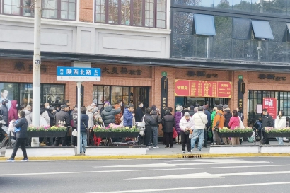 1月2日13:15,位于陕西北路105号的美新点心店门口大排长龙,队伍已经弯到威海路上——大家几乎都是冲着这家店的八宝饭而来。店长王师傅看着长长的队伍,提醒排在队伍中间靠后的市民,依据他的预估,他们大概率无法如愿以偿买到八宝饭了。