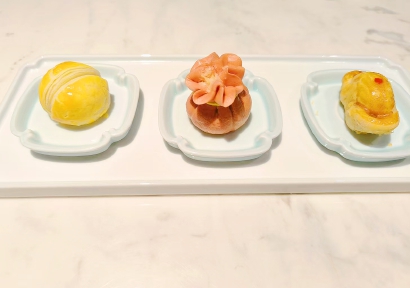 绿波廊副总经理王时佳为记者解密了3款点心的配方。她说,“开口笑”的原材料中西结合,用的黄油而非传统的猪油,馅心是腐乳肉做的。福袋外皮用甜菜粉做出红色效果,椰蓉椰丝为馅,还掺了点菠萝,吃起来甜而不腻,还有阵阵椰香。元宝酥是酥皮点心,内馅由红枣、咸蛋黄、松仁结合而成,甜咸搭配,别有滋味。