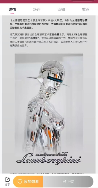 展览在大麦网购票页面的详情页中显示:“兰博基尼艺术中心致力打造前沿科技与艺术结合的时尚潮品平台……开创性的构建兰博基尼与艺术家联名限量款产品的产业平台。”此外详情页中还提到:“此次展览特别展出出自全球顶级艺术家空山基之手,高达2.4米全球限量三体之一的珍藏品‘机械姬’。”
