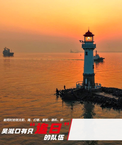 因为一年四季都能拍,拍到的背景各不一样,在吴淞口滨江道上,逐渐形成了一支“追日”的队伍。每天早晨,他们都来这里拍摄日出,从岸线的一头到另一头,像钟摆一样奔波。