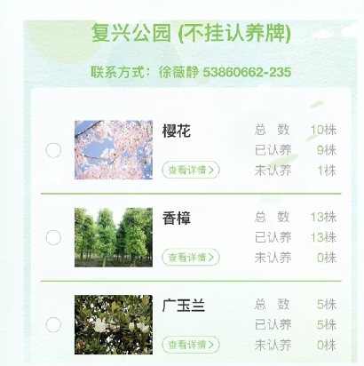 昨天上午11点08分,绿化认建认养平台上,复兴公园今年可供认养的樱花树总共10棵,显示“已认养”的有9棵,还有1棵待认养,其余13棵香樟、5棵广玉兰、6棵雪松等都显示“已认养”。
