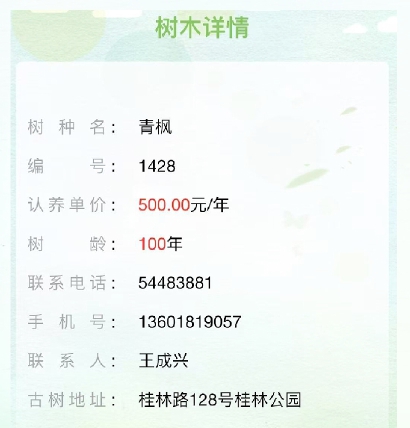 除了普通的树木,部分古树名木也可以让市民认养,一些绿地则开放企事业单位认养。