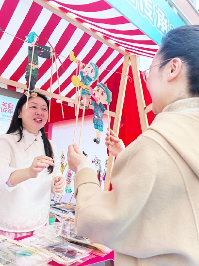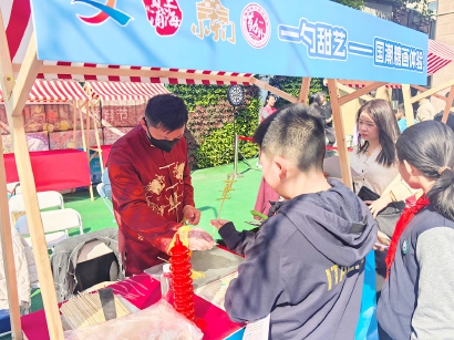 做一个生肖糖画、泥塑小人,玩一把皮影戏、飞车赛道,学一学五谷知识,撸一撸宠物解压……“文明实践风尚屋”的20多个摊位前,围满了来自周边的社区居民。