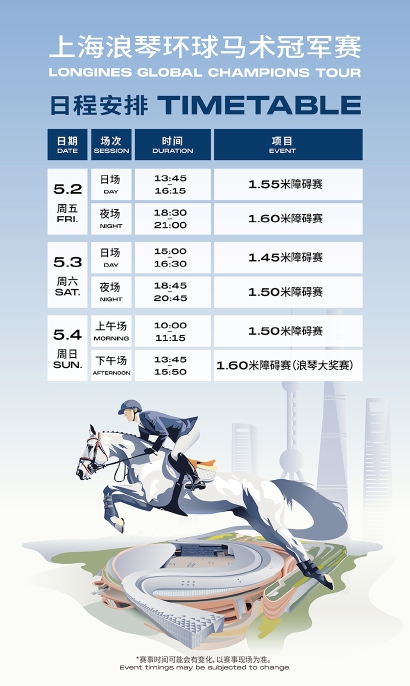 此外,每年最受瞩目的1.60米浪琴大奖赛将在5月4日下午场开赛;而5月2日的夜场比赛则是环球马术冠军联赛(GCL)的第二回合,障碍高度同样为1.60米。全球仅百余匹赛马能跨越这一障碍高度,极具可看性。