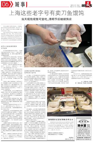 而沪上各家老字号的刀鱼馄饨几乎是伴随着青团一道上市的。那么,作为时令美食,老字号的刀鱼馄饨价格如何,市民能否接受?清明节之后,刀鱼馄饨是否还会继续供应?本期新闻晨报《上海会客厅》节目,我们就此采访了部分老字号,让我们跟着镜头去看看吧。