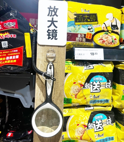除此之外,胖东来式的服务细节还是非常到位,货物旁有放大镜、易碎商品提供打包、水果蔬菜熟食区都有纸巾和湿纸、拖鞋和靠背货架旁边放椅子、鲜肉切丝、鲜活打养,烹饪小妙招、果切怎么吃才好吃等提示随处可见。