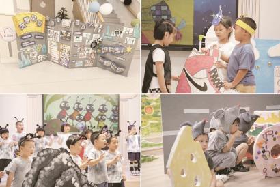 在充满魔力的创意工坊里,孩子们化身小小设计师与工程师:大班的“小鸟”们齐心协力组装鸟笼,中班的“小鞋匠”们专注描绘鞋样,小班的“小蚂蚁”和“小蝌蚪”们则为大石头添彩、为荷叶涂鸦。与此同时,“小小服装师”们热烈讨论着角色形象。大班“木兰军”巧用KT板拓印出铠甲般的纹理,小班“小蚂蚁”则用灵巧小手尝试扎染,一件件独一无二的演出服饰在画笔、彩纸与创意中诞生。走廊变身排练场,孩子们自主分组,反复琢磨台词、调整动作、配合队形。戏剧节前夕,温馨的“林间故事”成为勇气加油站。孩子们勇敢登台,用稚嫩童声深情演绎——或模仿大灰狼的低吼,或扮演妈妈温柔的叮咛。每一次大胆发声,都在为即将到来的绽放积蓄力量。