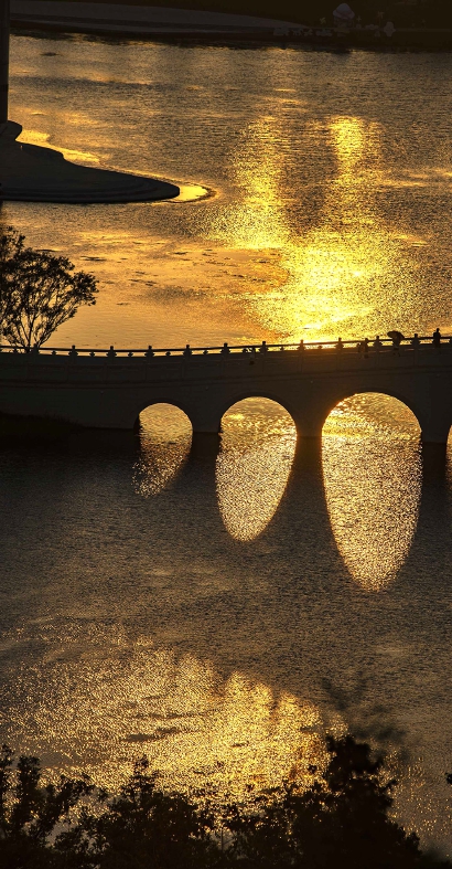 7月2日晚,何爷叔带着相机和脚架,骑着电瓶车花费1个多小时,从闵行赶到双子山。此前他曾多次上山踩点,终于在这个傍晚拍到了他所追求的画面:夕阳西下,湖面如镜,将落日的金光完美地倒映在桥洞之下,美不胜收。