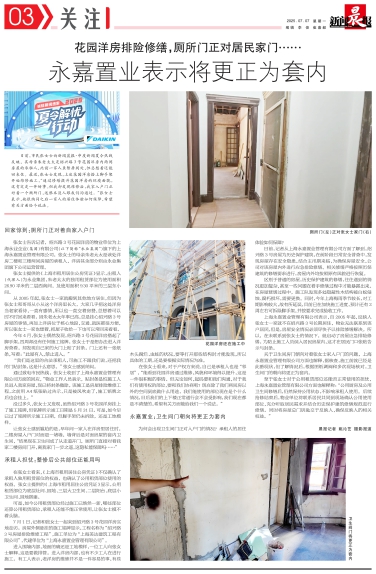 关于卫生间房门朝向对着张女士家入户门的问题,上海永嘉置业管理有限公司方面也解释,据核查,施工前就已经是此番现状,但了解情况后,根据图纸调阅和多次现场核对,卫生间门的朝向将更正为套内。
