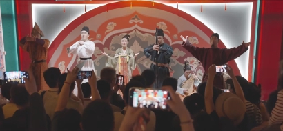 戏剧以“露华浓深——大唐生活美学展”为灵感源点,打破玻璃展柜的隔阂。观众不再是隔着时空的旁观者,而是能踏入动态投影铺陈的曲江池畔,与“李白”对饮清酒,随乐师指尖的羯鼓节奏叩响盛唐脉搏。当电子音效与复原古乐在剧场交织,《簪花仕女图》里的绢衣仕女转身时,轻纱拂过皮肤的微痒感,会忽然读懂何为“盛唐气象在姿态”。