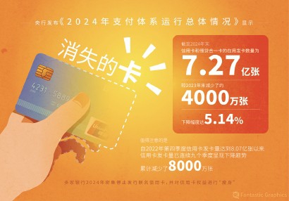中国人民银行《2025年第一季度支付体系运行总体情况》披露:截至一季度末,全国信用卡和借贷合一卡仅剩7.21亿张,较2022年第三季度峰值的8.07亿张减少8600万张,连续第十个季度环比负增长。2024年上市银行年报进一步佐证衰退:信用卡发卡量、交易额双降,部分股份行不良率突破3%。