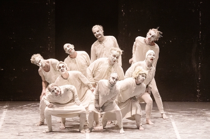舞台上的10位舞者是贝克特笔下人物的集合体,全身涂白,身着不合身的睡衣,步调一致地拖沓前行,动作精准。他们或随着哨声、鼓击节奏的进行曲踏出行军般的步伐,形如机械;或充满爱恨,他们分享生日蛋糕,拥抱亲吻;又或者饱受争斗、谩骂,宛如风雪摧残的流浪者。