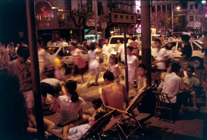 荷兰摄影师罗伯特·凡德·休斯特1990年到1993年来上海拍摄的时候,在南京路拍到了乘风凉的人。“11点的南京东路很热,人们住在非常小的空间里,没有空调,所以他们整晚待在那里。”