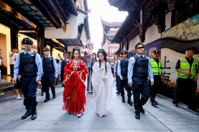 踏入豫园2号门,仿佛按下了“次元穿梭键”。被称为“中式浪漫天花板”的凝晖路,被还原成《天官赐福》中的极乐坊盛景;九曲桥畔,激光雾森中流转着《百妖谱》的百夭桃树与《雾山五行》的泼墨山水;旧校场路的明代演武场旧址,因《镇魂街》“这条街我说了算”的热血宣言而焕发新生。