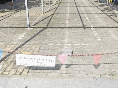 旺族商业广场入口位置旁边,也的确有一块空地,空地上安装了铁架。空地靠近广场一侧是一个非机动车车棚,停着一排非机动车,其他部分则空置着。但该处空间被铁链围住,同样挂着“请勿在广场内停放电瓶车”的提示牌。记者注意到,该处空地的路面铺贴与人行道完全连为一体,一般人的确不好区分是否在广场红线内。