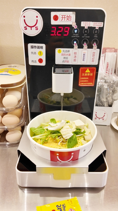 相较之下,另一家叫做“SYS自助拉面”的门店更像是一个传统的快餐店。在店内扫码购买套餐后,工作人员会引导顾客选择面、并指导他们使用自助泡面机。记者购买的是一个25元的套餐,包含任选一款泡面、一个无菌蛋、一瓶饮料以及豆腐、豆芽、泡菜等其他佐料。