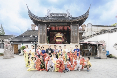 台风欲来的午后,三林老街的古戏台前,一群中小学生在学习舞龙。