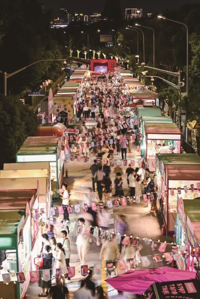 正大巷左,滨江在右,正大BINGO市集以“潮起正大,乐购滨江”为主题,将海派文化、云贵川泰风味、烘焙甜品文化以及热力演出等元素有机结合,打造多元文化交融的水岸联动步行街。主会场富城路汇聚了60余家环球风味摊位,呈现跨越国界的美食地图:特色小笼包、非遗打糕唤醒老上海记忆,贵州酸汤米粉、榴莲咖啡传递云贵川泰的独特风味,而法式爆浆可颂与碱水结则带来黄浦江畔的欧陆风情,每一口都是味蕾的极致享受。现场还设置了巨型甜品艺术装置,搭配粉紫霓虹主色调,完美复刻摩登夜上海的梦幻氛围。市集上更有吉祥物大象FUNFUN带着妹妹THA IM A IM A I惊喜亮相,围绕FUNFUN和THA IM A IMA I形象开发的系列周边产品等。除了富城路的主会场之外,正大广场馆内还开辟了两个市集分会场:外贸优品区在正大广场一楼西区,精选品质生活和时尚休闲两大板块外贸精品,涵盖环保精致的家居用品、净水器、不锈钢保温杯等,毛绒玩具、鞋类箱包等,所有展品均源自国内优质外贸厂商,为消费者送上“看得见、买得到”的世界好物。CH ILL一夏主题市集位于正大广场三楼黄金大道,二次元、谷子、甜品、创意饰品、精致小工艺琳琅满目,吹着空调也能逛夜市。