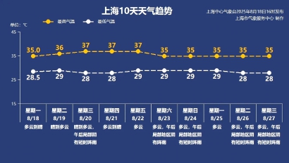 上海未来十天趋势预报显示,今天预计最高气温36℃,晴到多云的天气,全天气温在29℃-36℃之间;依旧吹东南风。