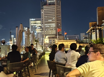 还有5位来自肯尼亚的朋友是被中国的合作伙伴带来外滩露台上谈生意的,他们先是在露台边上拍了一会美丽的夜景,然后坐下边喝酒变交谈,气氛十分融洽。带他们来的中国人表示:“外滩是我们上海的地标,一侧是百年历史的万国建筑博览群,另一侧则是陆家嘴的摩天楼宇集群。带外国朋友们来这里看看风景谈谈合作,大家心情也比较放松,聊得比较顺利也很有纪念意义。”