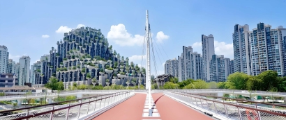 从空中俯瞰,百合桥呈“人”字形布局,桥梁主体和桥下的绿化景观布置又形成了一个“合”字。