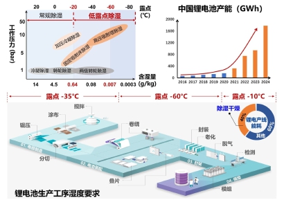 近年来,国内锂电产业爆发式增长,但除湿核心设备曾100%依赖进口。“宁德时代的供应商找到我们时,说进口设备相比国产设备足足贵了一倍以上。”在这样的背景下,代彦军团队创新地提出了一种变温变压集成式深度除湿技术,通过对热量、湿度和压力的综合调控,结合各除湿环节流程创新与温度压力优化,在满足出口空气露点要求的同时,成功摆脱了传统低露点除湿技术对高温和高压的依赖。